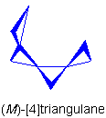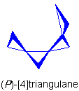 シクロプロパンをn個スピロ形につないでいった分子が[n]triangulaneで、直列につなげていくとnが4以上で全体のねじれによるキラリティが発生します。このようなねじれ分子は、ヘリシティー(らせん性)表示で、左ねじ形をマイナス(M)、右ねじ形をプラス(P)と表示します。