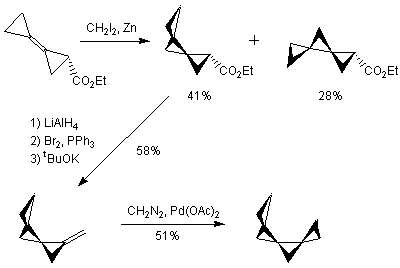出発物質からしてかなり面妖ですが、これはbicyclopropylideneのカルボキシレーションで容易に得られるカルボン酸を光学分割してつくることができます。このエチルエステルをSimonns-Smith反応でシクロプロパネーションすると、エキソ体とエンド体が41%と28%得られます。次にこのエキソ体の[3]triangulaneを還元、ブロモ化、脱臭化水素でエキソオレフィンに導きます。最後にパラジウム塩触媒下ジアゾメタン処理で目的の(M)-[4]triangulaneが生成しました。
