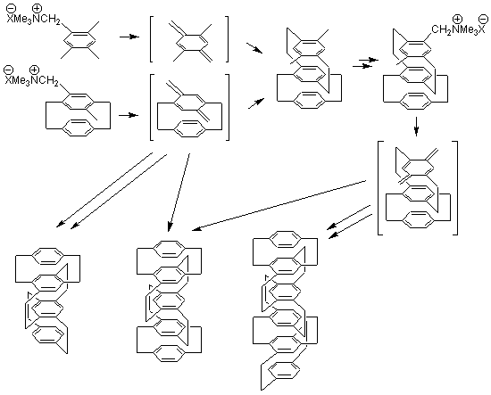 合成法は、やはり熱脱離反応によるp-キシリレン中間体を経る方法で、途中の分子間カップリング反応でのユニットの組み合わせによって、三層、四層、五層のちょうちんになります。できあがったちょうちんのキラリティは出発物質にキラルなパラシクロファン誘導体を用いていることによっています。