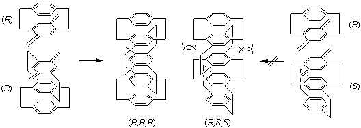 ところで、このカップリング反応では片方のユニットにラセミ体を反応させても生成物は片方にねじれたちょうちんになることが知られています。これはねじれを打ち消す方向の組み合わせでは、向かい合った枝の間の反発が生じるためです。