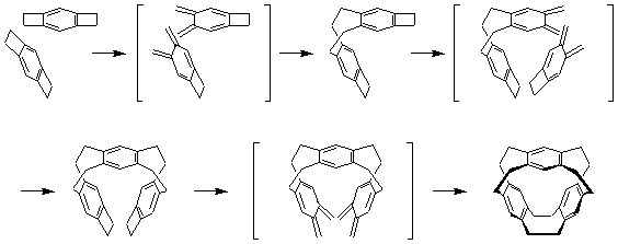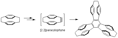 トリフォリアファンは分子が3回対称軸をもつ三つ葉のクローバー型をしているところから名づけられました。四つ葉じゃないのが残念ですが、中央がベンゼンなのでいたしかたありません。この三つ葉の合成は、[2.2]パラシクロファンのベンゼン環をつなぐエチレン鎖をハロゲン化、脱離を繰り返してなんと三重結合にしたものを3分子付加環化させて一挙に中央のベンゼン環を構築しています。途中のアルキン(パラシクロフィン)は直線であるべきsp炭素がほぼ直角に折れ曲っている高度のひずみ分子で、もちろん単離することはできません。