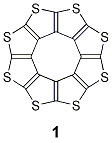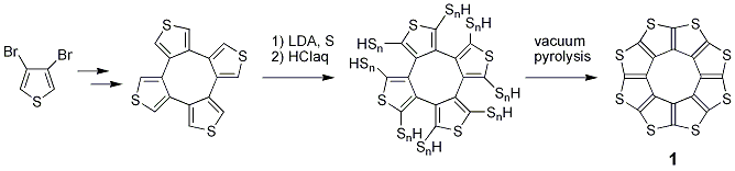 このひまわりの花、どうやって合成されたかというと、まず3,4-ジブロモチオフェンから誘導可能な環状テトラチオフェンをLDAですべての水素をリチオ化し、イオウを作用させてポリチオラートとします。これを塩酸でクエンチしてポリチオールとしてからそのまま真空熱分解反応に供すると、テトラチオフェンから80%という高収率で1が得られました。合成法をみると今までつくられなかったのが不思議なくらいシンプルですね。16当量のLDAとイオウを同時に作用させて一気にポリチオラートにするところが鍵だそうです。