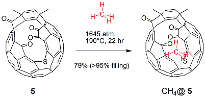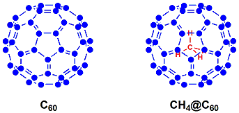 というへりくつはともかく(笑)、この球状分子フラーレンの内腔に物質を取り込んだまさに「カゴの鳥分子」があり、古くは希ガス原子や金属イオンを内包したものが知られています。これらはC60分子の合成時にえいやっと混ぜてしまう方法でつくられていたのですが、近年C60分子に酸化的に穴をあけて物質を取り込ませてから還元カップリングで穴を閉じる分子手術という方法が開発されて、これまでできなかった大型の分子を取り込ませることができるようになりました。たとえば水分子を取り込んだフラーレン(H2O@C60と表記します)はすでに京大化研の村田らのグループによって合成されています。前置きが長くなりましたが、最近同様の手法で内部にメタンを内包したCH4@C60が初めて合成されました。有機化合物を内包するフラーレンは初めての例であり、こうなるとおもしろ化合物でとりあげないわけにはいきません。