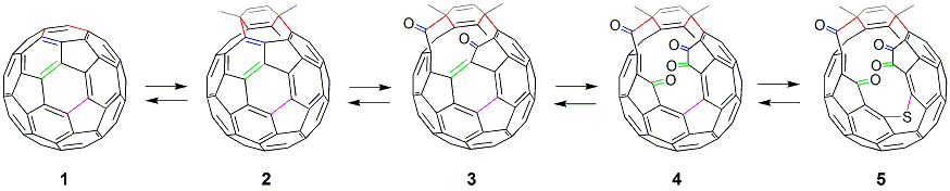つくり方は、まずフラーレンのベンゼン環のひとつを連続的な環化付加および異性化反応で8員環に拡大した付加基つきの2とします。次に反応性の上がった二重結合を順次酸化開裂して12員環の3次いで16員環の4とします。上記のH2O@C60のときはここで水分子を挿入したのですが、9000気圧という超高圧が必要でした。そこでさらなる環拡大策としてイオウの挿入によって17員環とした5がその後開発されました。ここまでが下準備です。