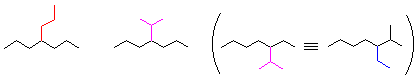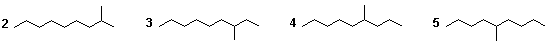 次に炭素鎖をひとつ減らして9個とし、メチル基の枝をつけたもの、すなわちメチルノナンの異性体がある。ノナンの9個の炭素のうち両端の1位や9位の炭素に枝をつけると上のデカンになってしまうので、メチル基をつける位置は2位から8位までで、分子は左右対称だから異性体は2(8)、3(7)、4(6)、5の4通りとなる。ノナンの誘導体はこれしかない。