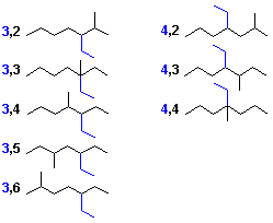 次いでエチルジメチルヘキサン。これもやはりエチルヘキサンをまず決めてメチル基を2個つけてゆく要領だ。エチルヘキサンは3-エチル体しかないが左右非対称なので2,2、2,3、2,4、2,5、3,4、3,5、4,4、4,5、5,5の9種がある。