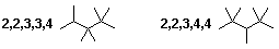 ヘキサンにプロピル基をつけることはできない(どうやってもC6を超える)ので、次はペンタンの誘導体になる。まずペンタメチルペンタン。たくさんありそうだが、メチル化できる位置は2〜4位しかなく、その6個の水素の5個をメチル置換することになるから、結局水素が2〜4位にそれぞれ残ったものしかなく、おまけに2位と4位は対称だから2種しかない。