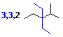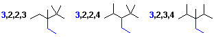 次が、エチルトリメチルペンタン。エチル基の位置は3位しかありえずしかも左右対称なので、メチル基の位置は2,2,3、2,2,4、2,3,4の3種しかない。